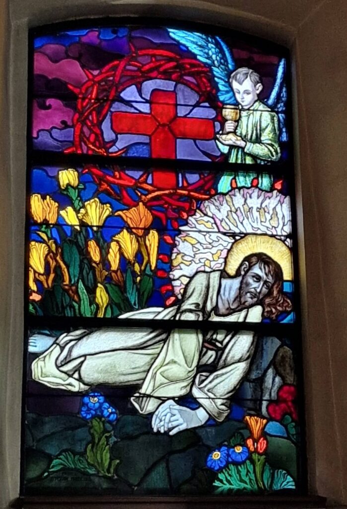 Po lewej, północnej stronie, Jezus w młodopolsko ukwieconym Ogrójcu klęczy czy też leży oparty o kamień i przeżywa wizję Męki – krwawy krzyż w ciernistym wieńcu ognia. Anioł Go umacnia, gdy prosi o odsunięcie kielicha-przenaczenia cierpienia.