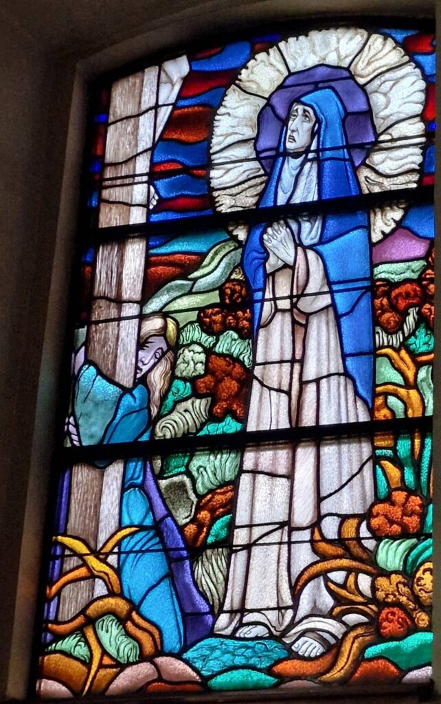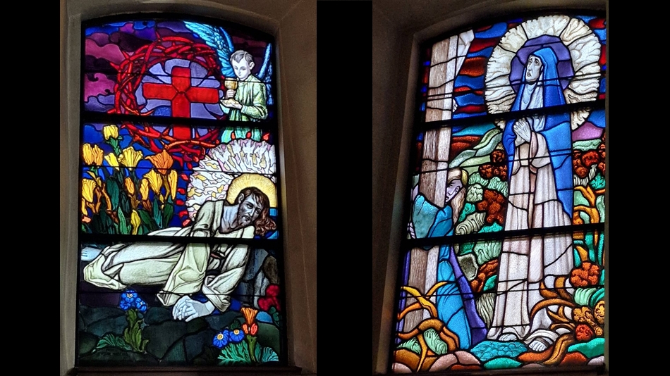 W południowym witrażu kwiaty zwiędły. Spełniła się Jezusowa przepowiednia: jeśli z zielonym drzewem to robią, cóż się stanie z uschłym? Maria Magdalena klęcząc obejmuje krzyż. Matka Boska stoi, patrzy z przejęciem, ręce załamuje: co oni z Tobą zrobili, Synku?