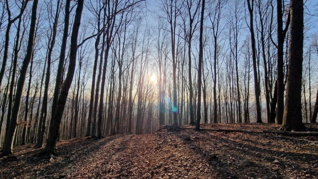 A na szczycie zadziwia mdło widoczny kamienny krąg, podobny tym na Palenicy i Ostrym. Resztki warowni, punktu obserwacyjnego? Czy miejsca kultu albo cmentarzyska? Buk jeden wie. I cała tutaj się srebrząca, odwieczna bukowa rodzina.