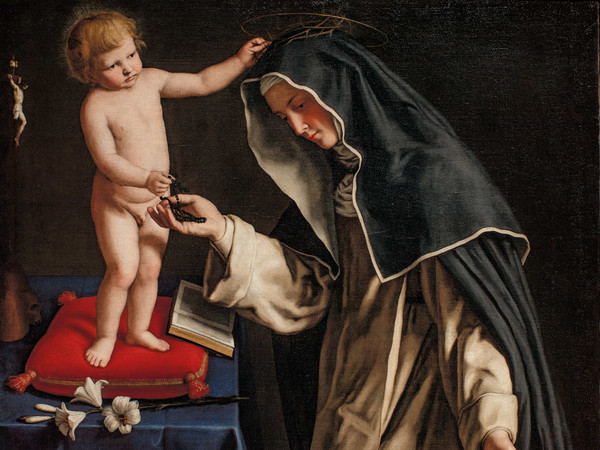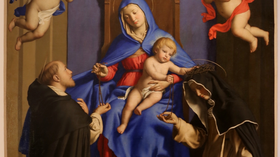 Fragment Madonny Różańcowej Salviego: Katarzyna ze Sieny przyjmuje różaniec z rączki małego Jezusa.